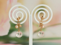 ピンクゴールドのフェミニンジュエリー。ちっちゃなパールも かわいい揺れるクリスタルピアスです。 |